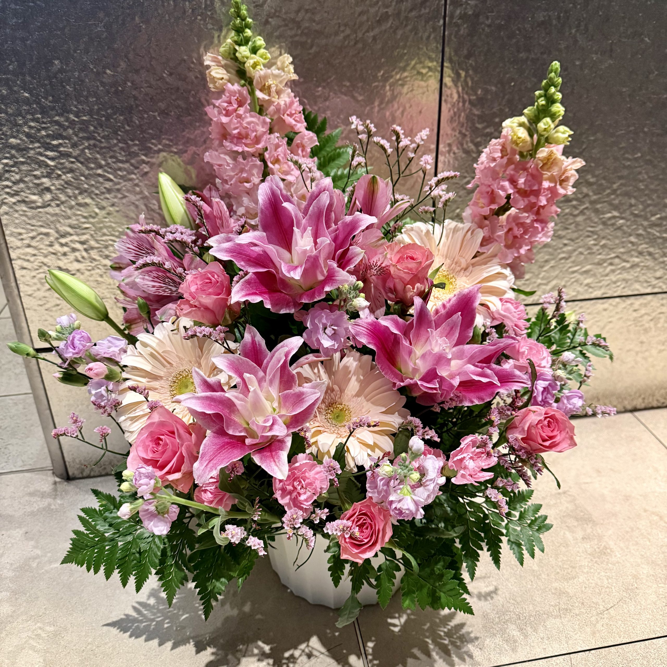個展の作品イメージに合わせてピンクを基調とした華やかなアレンジメントをお作りいたしました💐